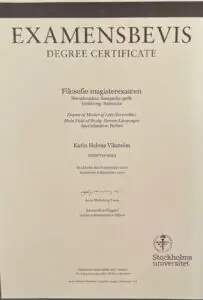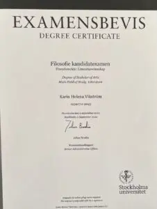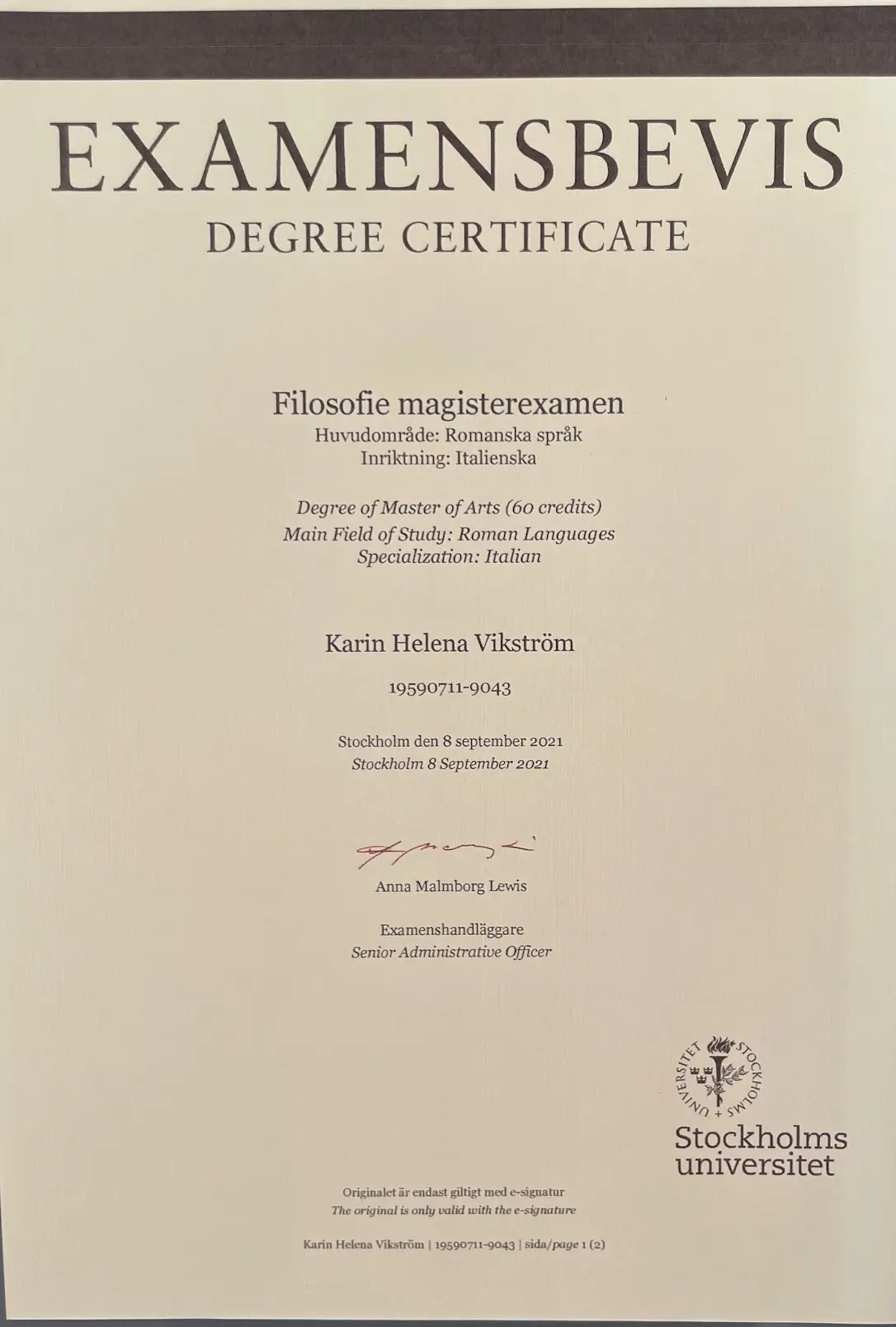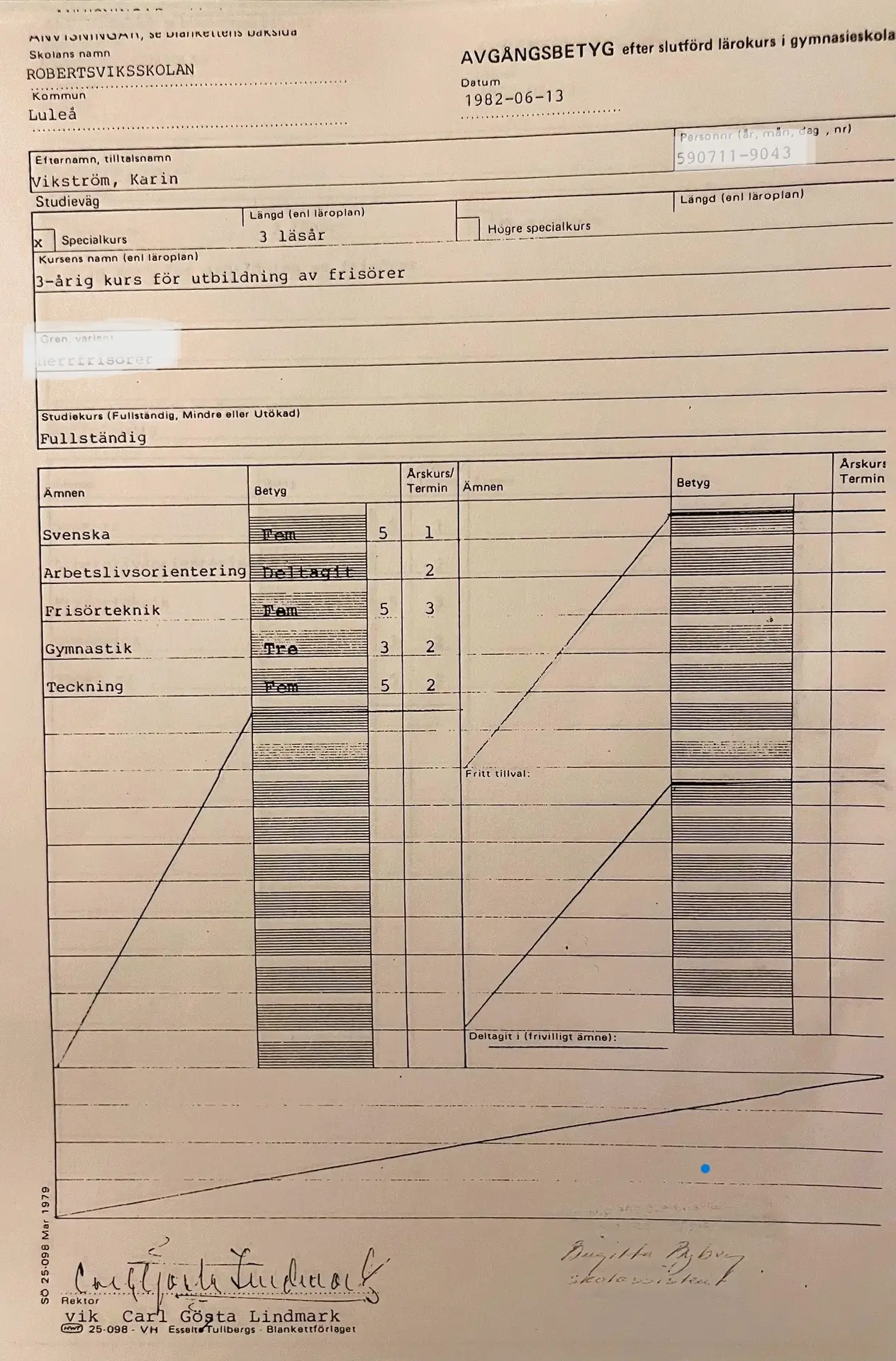 De flesta frisörer jag känner har en konstnärlig ådra, något som inte sällan brukar ta sig uttryck utöver själva yrkesutövningen. Själv har jag som autodidakt till och från genom åren ägnat mig åt naivistiskt måleri, resultaten av det kan ni se på min sida karinskonst. Då jag också ofta sytt mina egna kläder och dessutom älskar återvinning har jag haft försäljning av handväskor, tillverkade av alla tygbitar som blivit över, de kan man se på karinsvedese. Jag kände dock att jag, trots kärleken till frisöryrket, målningen och sömnaden ville vidga mina vyer. Det ledde till studier vid Stockholms universitet och ett antal akademiska examina; bland annat en magisterexamen i italienska och en kandidatexamen i litteraturvetenskap. Studierna har i sin tur lett till många fina samtal med mina litteratur- och språkintresserade kunder.